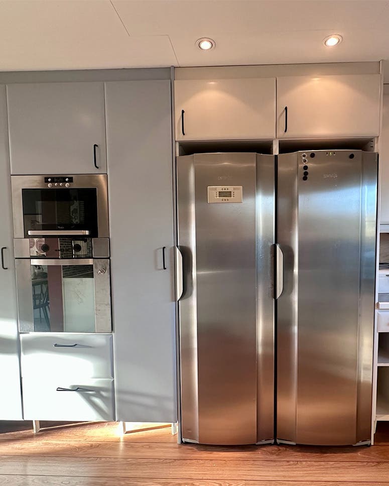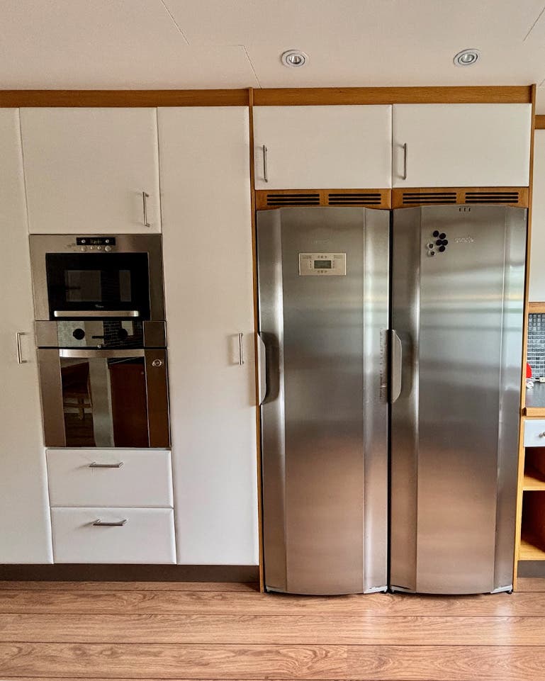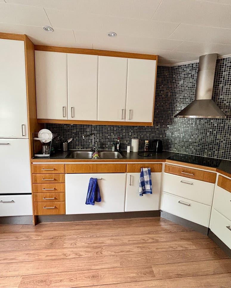 Köket var först tänkt att lämnas orört, men efter att ha sett trappans förvandling vågade de ta steget. På rekommendation från VYTA målades luckor och skåp med specialfärg för snickerier. Förvandlingen blev total – utan att ett enda skåp behövde bytas.