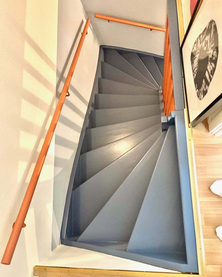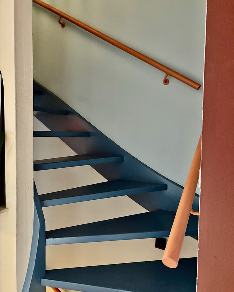 En av de mest iögonfallande förändringarna blev trappan. Med mörkblå steg och peachfärgade räcken blev den en skulptural detalj som binder samman våningsplanen. Resultatet är både praktiskt och vackert – och med fem barn märks dammet knappt.