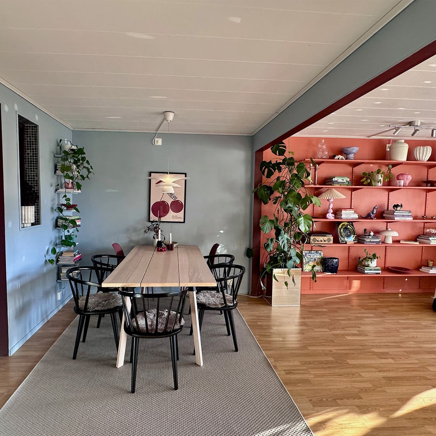 Här blev Vyta Luleå en avgörande partner. Med kunskap, rådgivning och rätt produkter fick de stöd i att välja färg för olika ytor – från snickerier och trappor till köksluckor. Tillsammans testade de kulörer i olika ljus och hittade sin unika palett: två nyanser av blått, en mjuk aprikos, en varm peach och en blodröd accent.