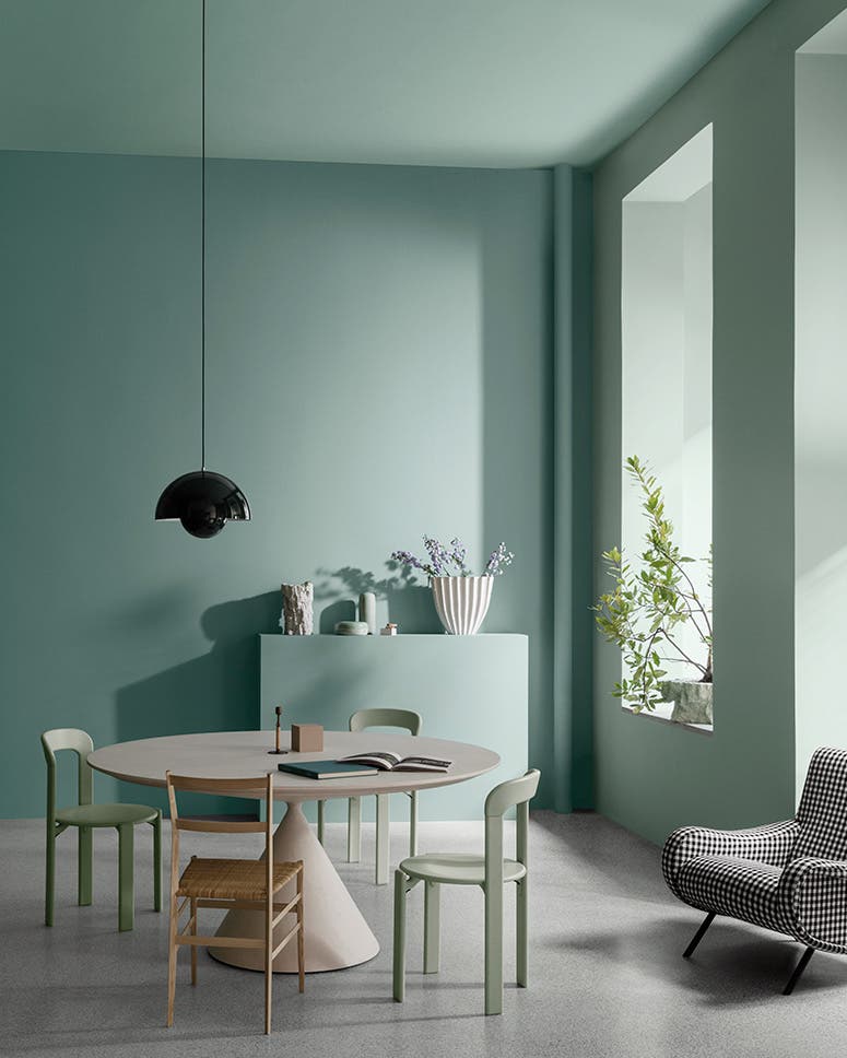 Jotun LADY Spring Breeze, 6167 (yttre vägg), Sunny Green, 8596 (lister) och Secret Green, 7718 (inre rum)